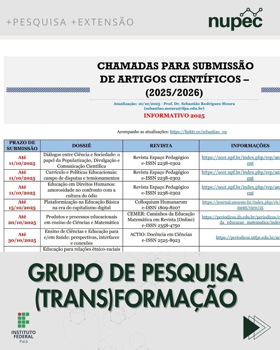 Grupo de Pesquisa (Trans)Formação Sebastião Rodrigues Moura, Departamento de Ensino, Pesquisa, Inovação e Extensão O “Informativo 2025/2026 – Chamada para Submissão de Artigos Científicos” é uma produção que desenvolvo Read More »